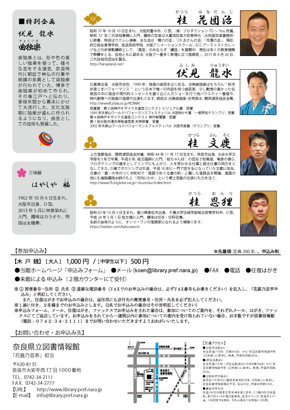 桂花団治、桂文鹿、桂恩狸。特別企画は伏見龍水の「曲独楽(きょくごま)」。