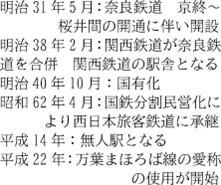 | 桜井駅 桜井市桜井 ・明治26年5月23日:大阪鉄道の高田駅~桜井駅間開通時に終着駅として開業 ・明治31年5月:奈良鉄道の京終駅~桜井駅間開業。大阪鉄道と奈良鉄道の駅となる。 ・明治33年6月:関西鉄道が大阪鉄道路線を継承 ・明治38年2月:関西鉄道が奈良鉄道の路線を継承 ・明治40年10月:関西鉄道国有化 ・昭和58年4月:貨物の取り扱いを廃止 ・昭和62年4月:国鉄分割民営化により西日本鉄道(JR西日本)の駅となる ・平成7年3月:橋上駅舎と自由通路の併用を開始し、近鉄と改札口を分離 |