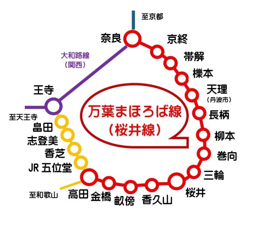 | 万葉まほろば線 (桜井線:奈良駅から大和高田市の高田駅をむすぶ。 平成22年(2010)に愛称がつけられた) |