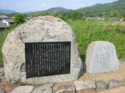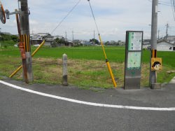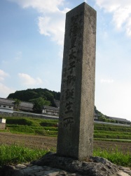 | 写真:平成22年(2010)6/5 寺の北側ではなく寺の東北の方向300メーターの所に移動されているようです。 寺の北側には比較的新しい道標が作られています。写真の後方が橘寺です。 橘寺の受付に尋ねると昔の寺の敷地跡の目安として道標が置かれているそうです |