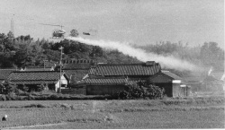 | 1964-8-17日本脳炎予防のためBHC散布する 川崎ーBELL 47G 押熊 撮影:木村守男氏 蚊の駆除のためヘリコプターで薬剤散布 |