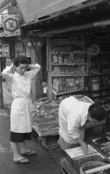 | 銀座通りの末広商店 野菜・果物・干物など秤売り 昭和35年 写真撮影:秦 峰一氏 | ||||||