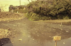 金魚池の泥かき 昭和35年頃 新木町 写真撮影:秦 峰一氏 ヘドロの固まりや凹凸をなくし。池床を平らにならす作業 |