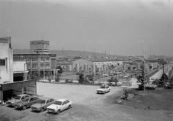 | 近鉄郡山付近の風景 昭和47年 奈良社会保険病院(現JCHO大和郡山病院)屋上より 写真撮影:秦 峰一氏 駅前に三和銀行、駅前はバスターミナル、奥にパチンコ店、 |