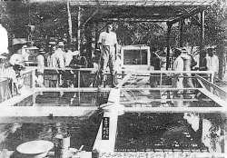 | 金魚の出荷準備 昭和35年新木町 写真撮影:秦 峰一氏 木桶で運んでた |